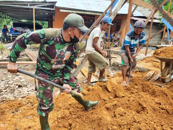 Hal ini dapat dilihat saat warga masyarakat desa Kasarangan RT. 008 RW. 003 Kec. Labuan Amas Utara Kab. Hulu Sungai Tengah bersama anggota Kodim 1002/HST bergotong royong menguruk pondasi renovasi Musholla Noor Iman salah satu sasaran tambahan dalam program TNI Manunggal membangun Desa (TMMD) ke-112 tahun 2021 Kodim 1002/HST, Senin (13/09/2021) sore