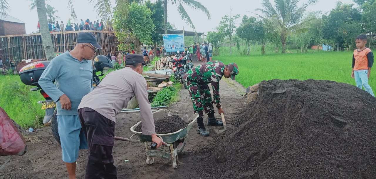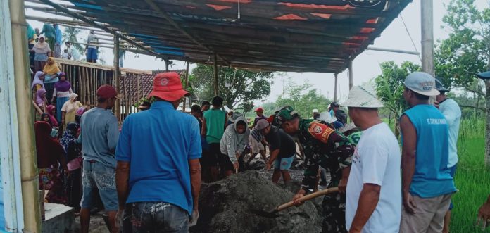Sertu Heriman terlihat bersama puluhan warga Dusun Kebun Dewa Desa Kalianyar bahu membahu bergotong royong membangun Musala Nurul Ikhlas yang berukuran 10 x 10 meter.