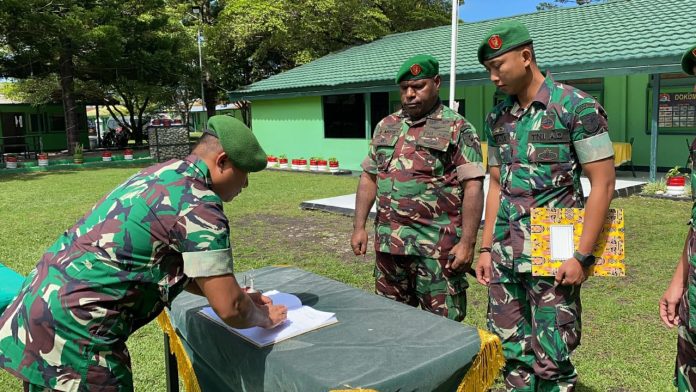 Wamena, Berita-Kita | Dandim 1702/JWY Letkol Cpn Athenius Murip, S.H.,M.H memimpin acara Corps Raport tradisi pindah satuan anggota Kodim 1702/JWY bertempat di lapangan upacara Kodim 1702/JWY jln Yos Sudarso Kabupaten Jayawijaya. (05/01/2023)