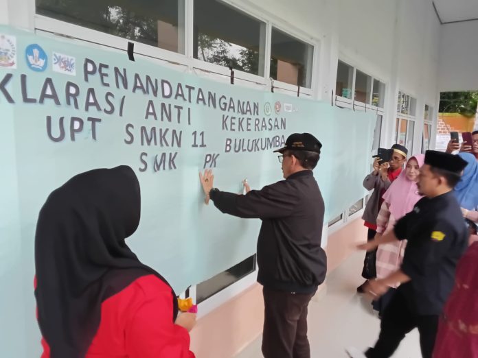 Sebelum memasuki Aula kegiatan workshop, Sekdisdik A Ibrahim membubuhkan tandatangan dukungan deklarasi anti kekerasan/bullying di SMKN 11 Bulukumba, Jalan Poros Sapobonto, Kec Bulukumpa, Kab Bulukumba.