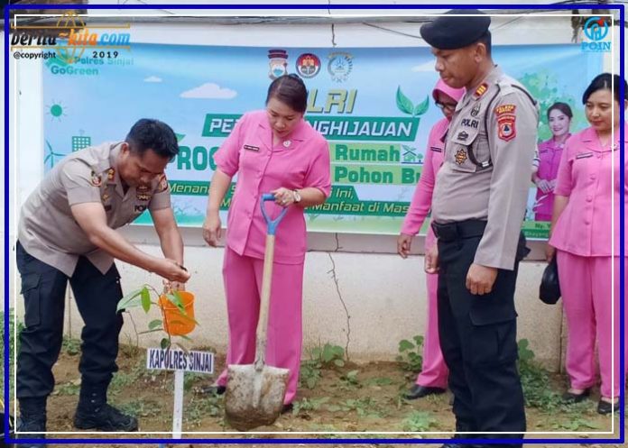 Sinjai, Berita-Kita | Kepala Kepolisian Resor Sinjai Ajun Komisaris Besar Polisi (Akbp) Sebpril Sesa, S.Ik didampingi Ketua Bhayangkari Cabang Sinjai Ny. Yovita Sebpril Sesa, pimpin personel laksanakan penanaman pohon sekitar mako dalam rangka mendukung program gerakan penghijauan, Sabtu (04/01/2019).