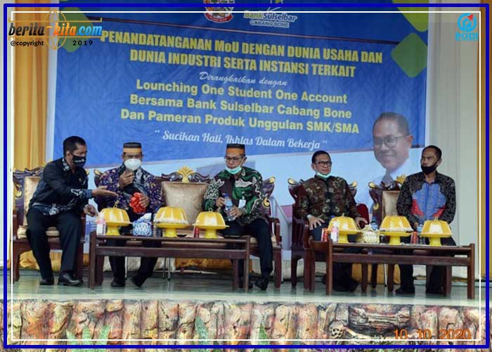 Bone, Berita-Kita | Kepala Dinas Pendidikan Provinsi Sulawesi Selatan, Prof Dr Muhammad Jufri, M.Si, M.Psi, Psikolog kembali menjadi saksi ‘perkawinan massal’ (penandatangan MoU) antara SMK dengan dunia usaha dan dunia industri di SMK Negeri 1 Bone, Jl Lapawawoi Kr Sigeri Watampone, Sabtu (10/10).