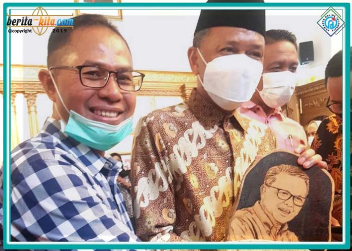 Prof Jufri menyampaikan ucapan selamat Ulang Tahun sambil menyerahkan cendramata berupa lukisan diri Gubernur Sulsel di atas ukiran kayu.