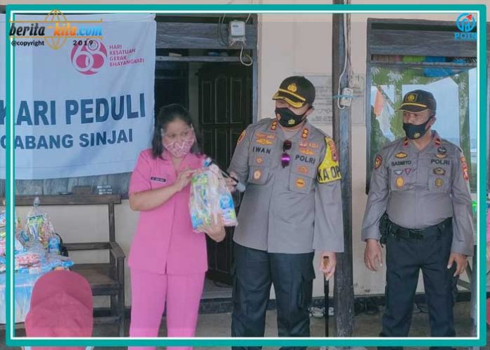 Sinjai, Berita-Kita | Dalam Rangka HKGB (Hari Kesatuan Gerak Bhayangkari) Ke-68 Tahun 2020, Kapolres Sinjai Akbp Iwan Irmawan, S.Ik.,M.Si bersama Ketua Bhayangkari Cabang Sinjai Ny. Dewi Iwan Irmawan melaksanakan serangkaian kegiatan yang salah satunya adalah Bakti sosial kepada warga yang kurang mampu dikecamatan Pulau Sembilan.