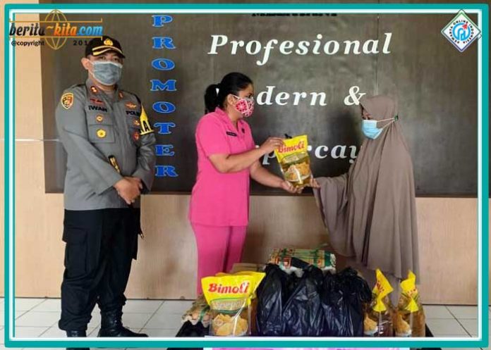 Sinjai, Berita-Kita | Kepala Kepolisian Resor Sinjai, Ajun Komisaris Besar Polisi (Akbp) Iwan Irmawan, S.Ik.,M.Si didampingi Ketua Bhayangkari Cabang Sinjai Ny. Tungga Dewi Iwan memberikan bantuan sembako kepada seluruh PHL yang bekerja dilingkungan Polres Sinjai, Selasa (22/12/2020).