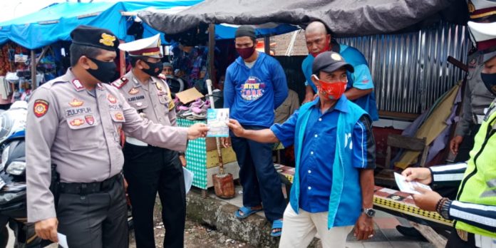 Sinjai, Berita-Kita | Operasi Zebra 2020 hari ke-9 (sembilan), Personel Satuan Lantas Polres Sinjai membagikan Brosur imbauan tertib berlalu lintas dan patuhi protokol kesehatan cegah Covid-19, bertempat diterminal pasar Sentral Sinjai, Kelurahan Balangnipa, Kecamatan Sinjai Utara, Kabupaten Sinjai, Selasa pagi (03/11/2020).