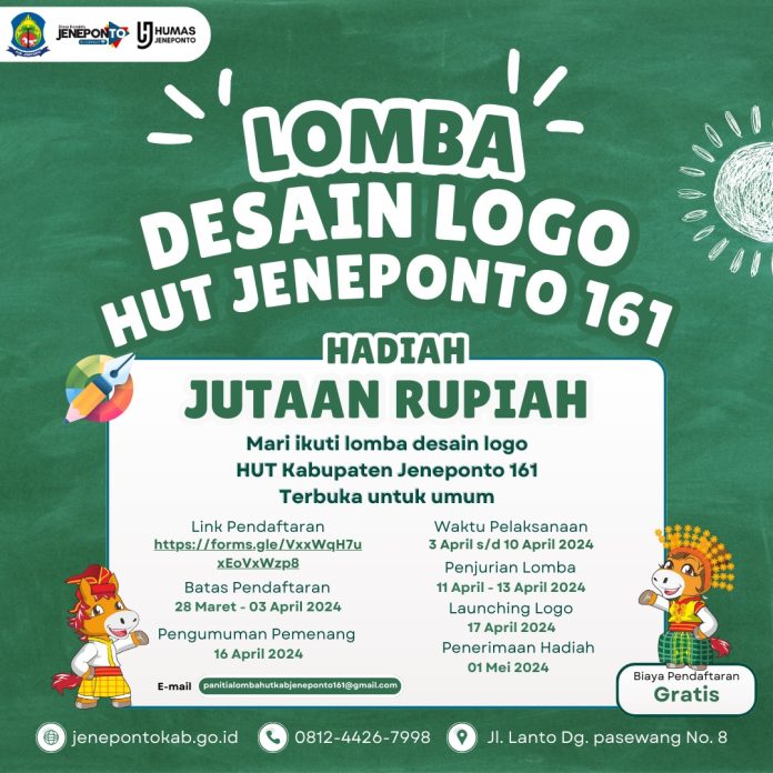 Jeneponto Beritakita.com I Jelang perayaan Hari Jadi Jeneponto ke-161, Pemkab Jeneponto melalui panitia pelaksana menggelar lomba desain logo hari Jeneponto. Lomba tersebut digelar secara online, dimana peserta mendaftar dan menampilkan desain logonya melalui link formulir pendaftaran online pada https://forms.gle/VxxWqH7uxEoVxWzp8