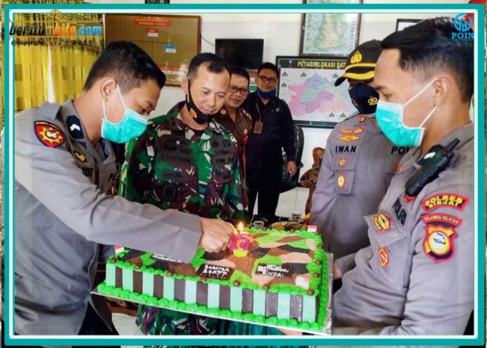 Sinjai, Berita-Kita | Memperingati Hari Ulang Tahun (HUT) TNI yang Ke-75 Tahun 2020, Kepala Kepolisian Resor Sinjai Ajun Komisaris Besar Polisi (Akbp) Iwan Irmawan,S.Ik.,M.Si memberikan kue kejutan ulang tahun kepada Dandim 1424 Sinjai, Senin (05/10/2020).