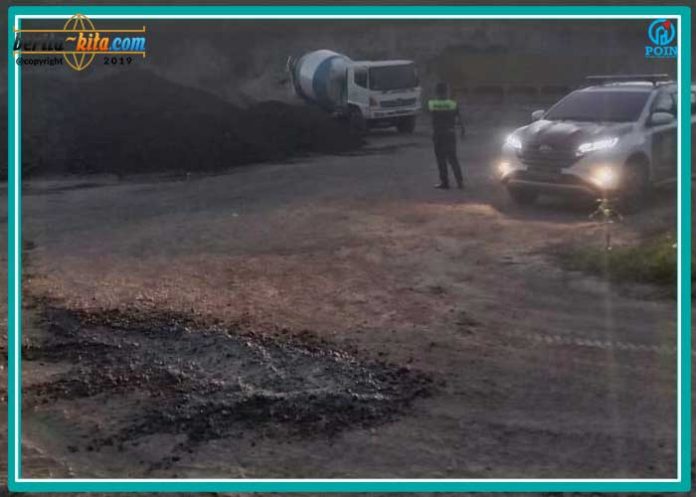Terpantau Personel Satuan Lalu Lintas Polres Sinjai dipimpin Bripka Roely melakukan koordinasi dengan pihak PT.Purnama Karya Nugraha selaku pemilik usaha pengangkut material untuk segera membersihkan tumpahan material dijalan untuk mengantisipasi terjadinya kecelakaan lalu lintas akibat tumpahan material tersebut.