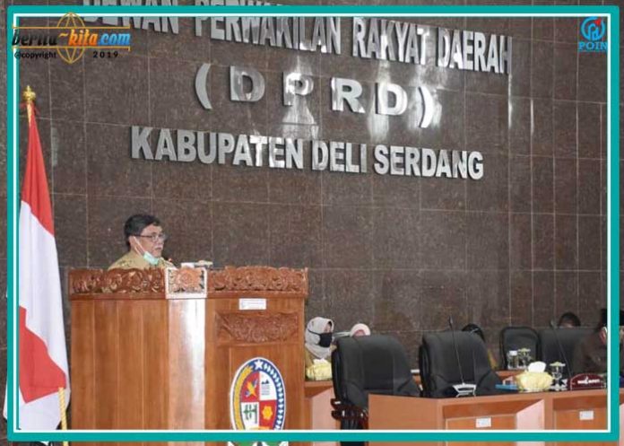 Lubuk Pakam, Berita-Kita | Wakil Bupati Deli Serdang menghadiri rapat Paripurna DPRD Kabupaten Deli Serdang untuk menyampaikan jawaban pemerintah terhadap pandangan umum fraksi-fraksi DPRD Kabupaten Deli Serdang atas laporan tentang pertanggungjawaban pelaksanaan APBD Tahun Anggaran (T.A.) 2019 bertempat di ruang rapat DRPD Kabupaten Deli Serdang, Sumatera Utara, Selasa (07/07/2020).