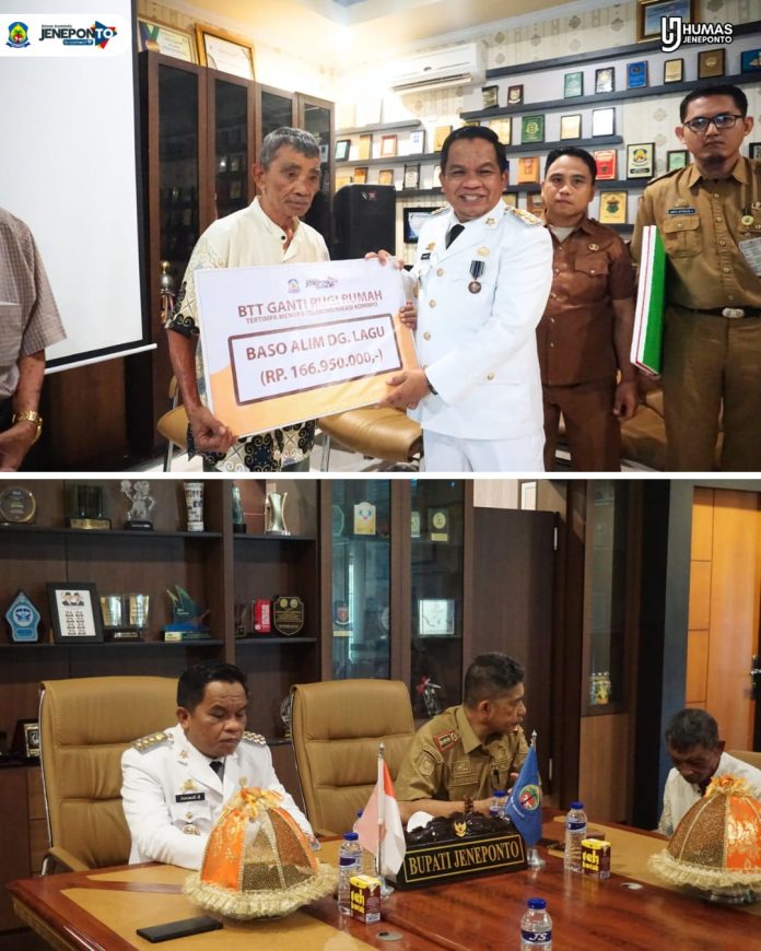 Jeneponto Beritakita.com I 23 Juli 2024  Penjabat Bupati Jeneponto, Junaedi menyerahkan bantuan belanja tak terduga kepada warga yang terdampak runtuhnya menara telekomunikasi Kominfo. Penyerahan bantuan ini dilaksanakan di ruang rapat Forkopimda sebagai bentuk ganti rugi atas kerusakan rumah tempat tinggal warga.